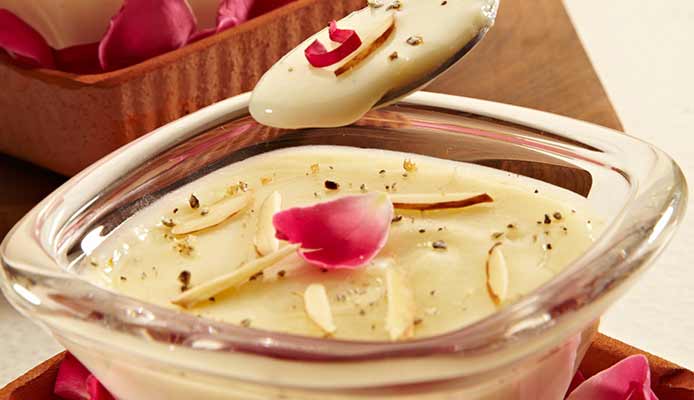 Include elaichi powder and rose water. Leave to cool and set in a cooler. Serve decorated with flower petals.